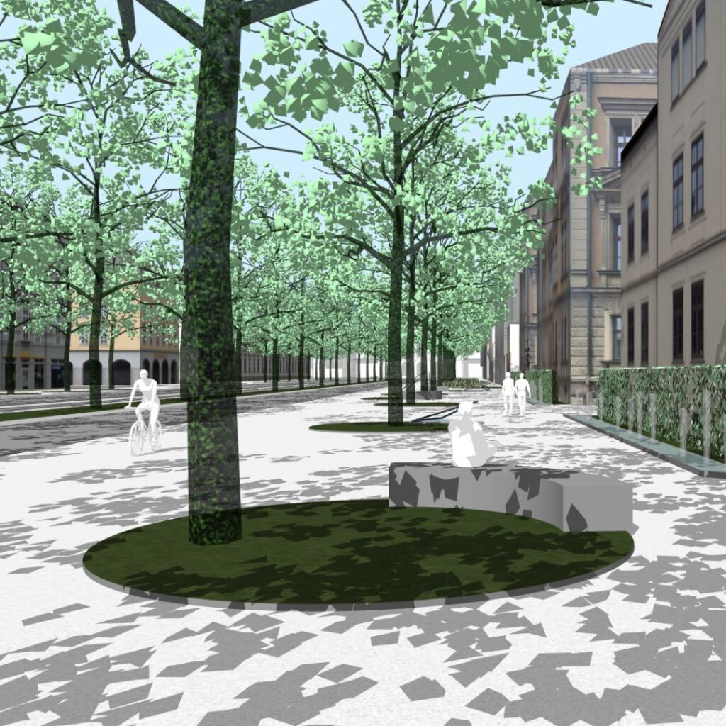 Ein Konzept zur beidseitigen Sanierung des Straßenzuges und zur optimalen Ergänzung der ursprünglich vier Alleereihen mit klimatisch wirksamen erdverwurzelten Bäumen wurde dementgegen nicht vorgelegt.